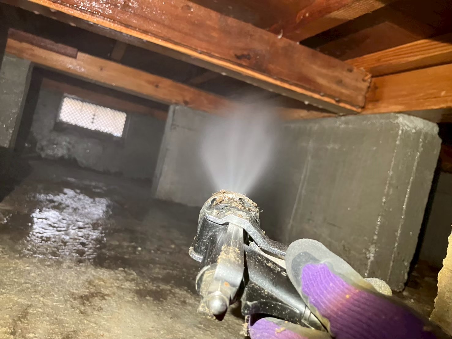 床下に潜り奥からシロアリ用薬剤を散布いたします。