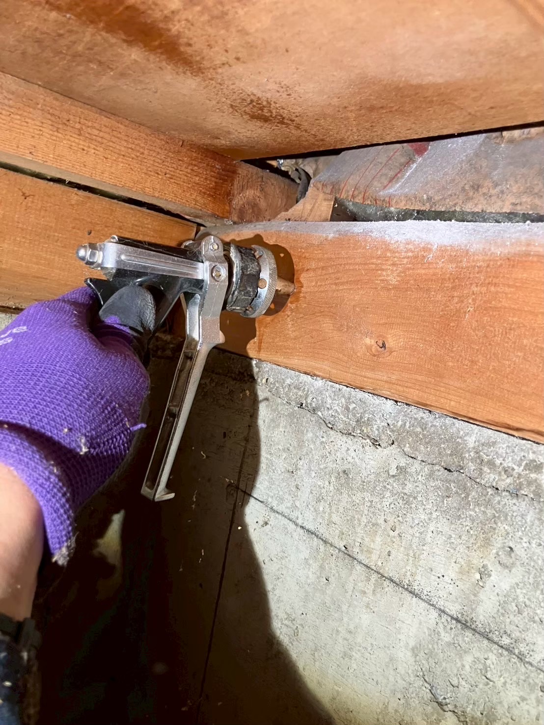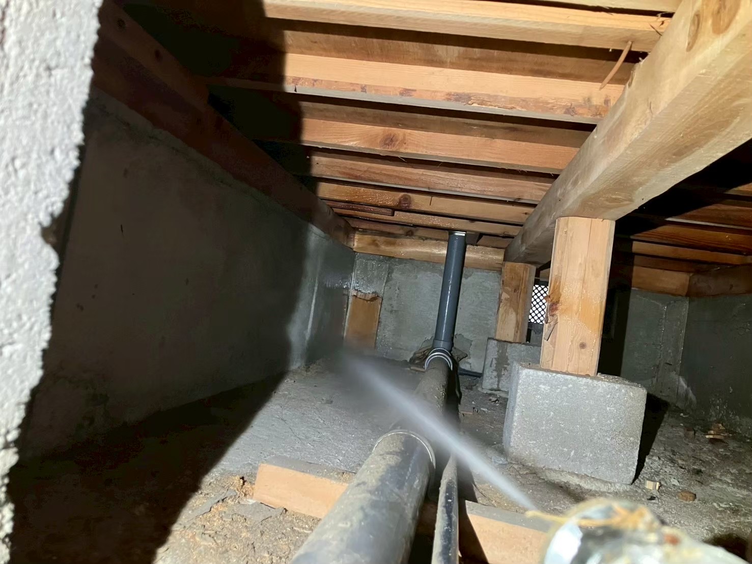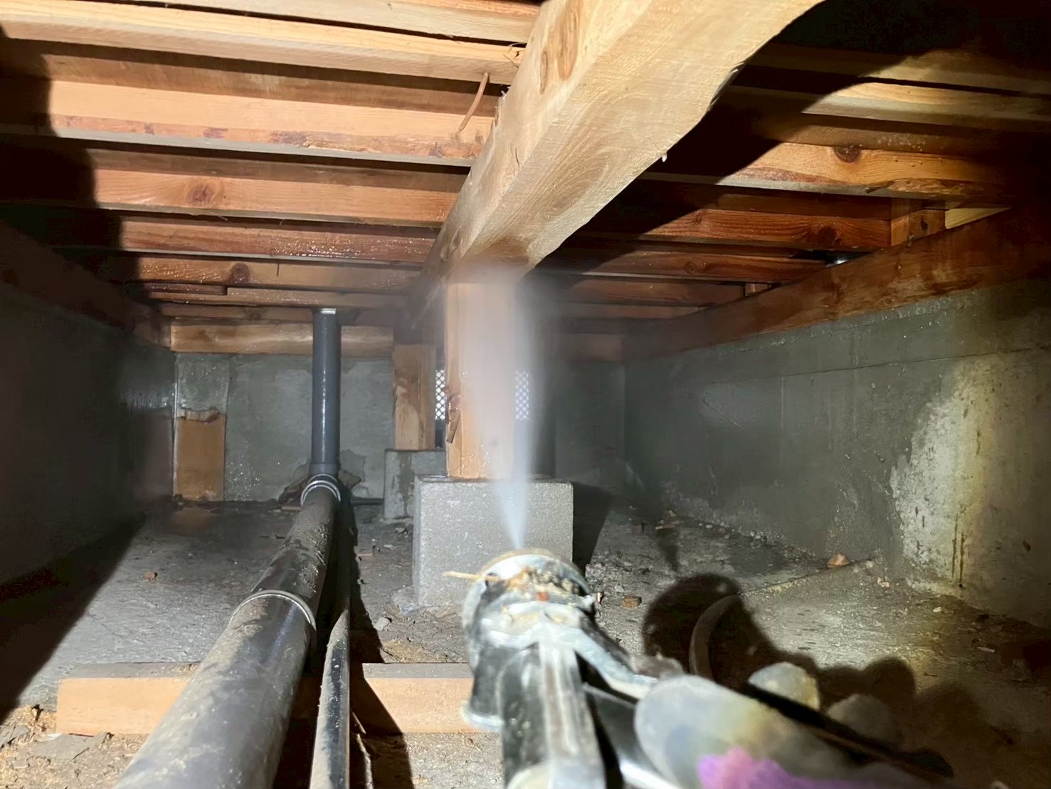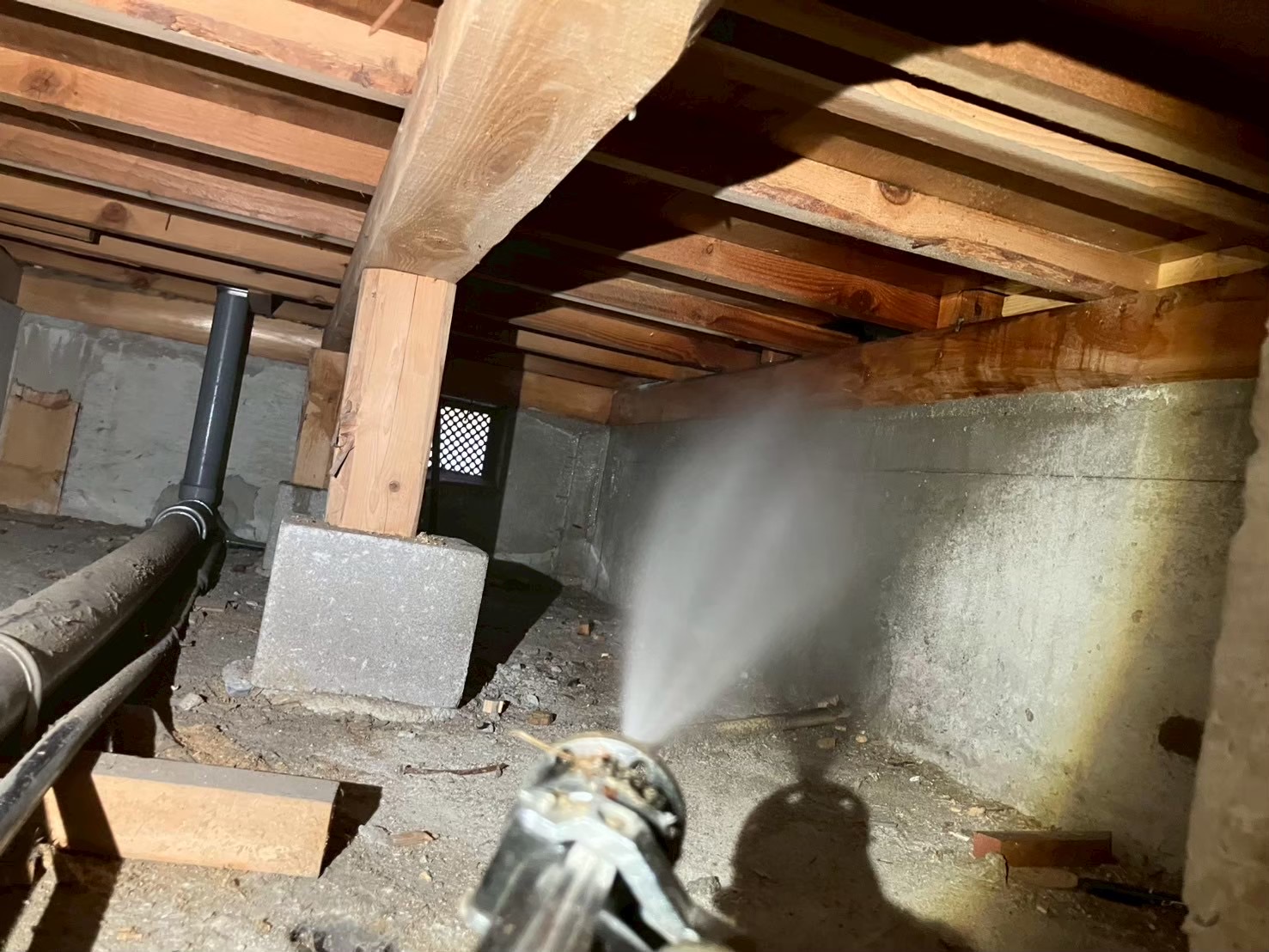 床下に潜り奥からシロアリ用薬剤を散布いたします。